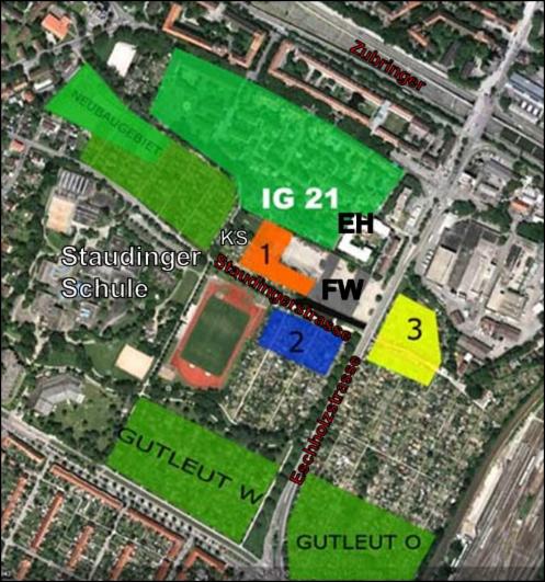 Aus der Vogelperspektive sieht man eindrücklich wie der momentan vorgesehene Standort 1 (rot) von Wohngebieten (grün), einem Seniorenheim (Erlenhof, EH) einem Kinderspielplatz (KS) und einer großen Schule (Staudinger) umgeben ist. Bei "2" (blau) und "3" (gelb) handelt es sich um bisher von der Stadt nur oberflächlich geprüften Standortalternativen.