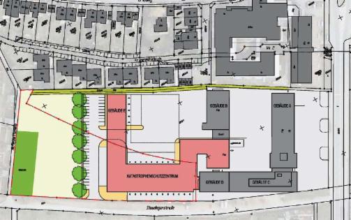 Rot - geplante zusätzliche Gebäude. Der südliche (untere) Gebäuderiegel wird den auf dem Übungshof generierten Schall voll in das nördlich gelegene Wohngebiet zurückwerfen und dadurch nochmals verstärken...